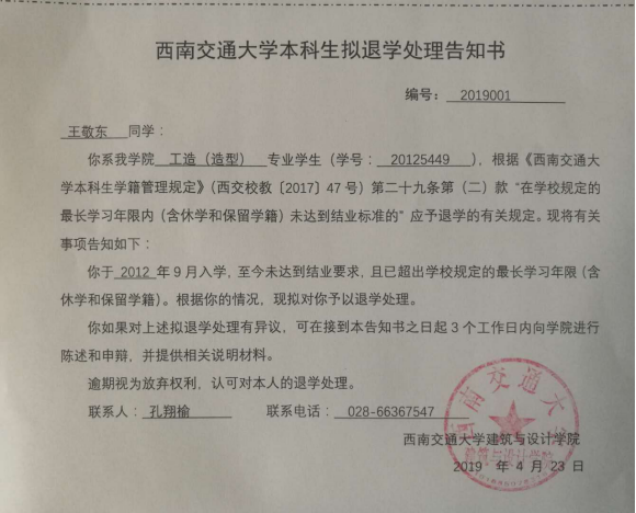 《关于拟对王敬东同学作出退学处理的告知书》已于2019年4月19日发至云顶老虎机 ,因云顶老虎机 无法与本人取得联系,用其他方式也无法将其送达,现将《关于拟对王敬东同学作出退学处理的告知书》予以公告。自本公告发出之日起满15个工作日,视为送达。