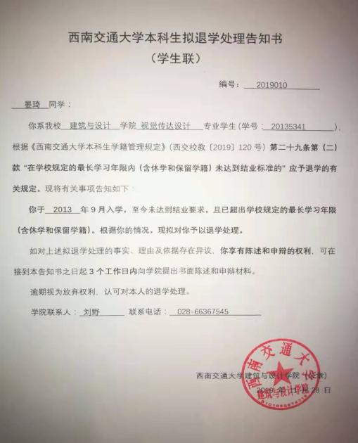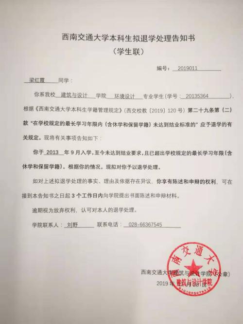 根据《西南交通大学本科生学籍管理规定》第二十九条第(二)款 “在学校规定的最长学习年限内(含休学和保留学籍)未达到结业标准的” 应予退学的有关规定,拟对下列同学进行退学处理,因云顶老虎机