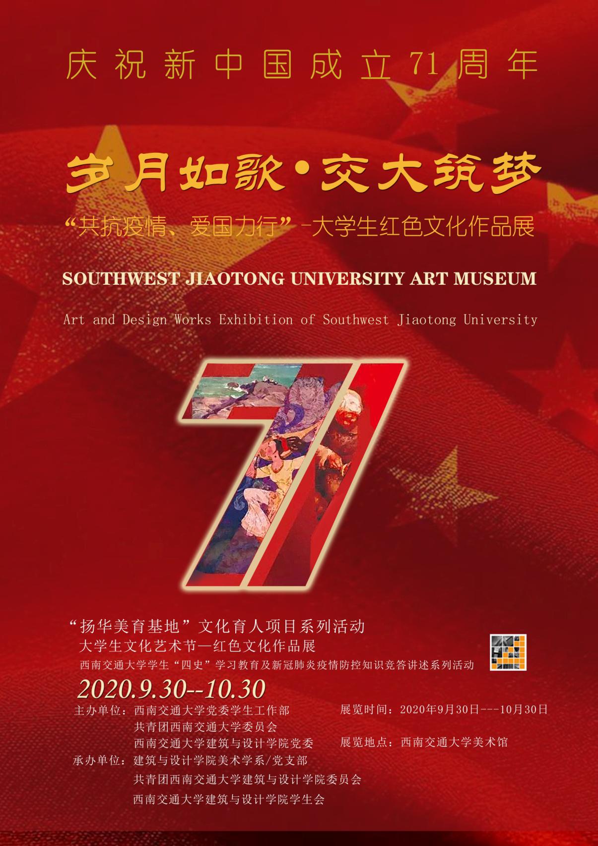 学生会承办的 “岁月如歌·交大筑梦”庆祝新中国成立71周年艺术&设计作品展即将在西南交通大学美术馆举办。本次艺术展面向全校师生征集不同类型的书法、绘画、综合材料、艺术设计等作品,主委会将组织专家评审组评审、择优展出。我们既鼓励传统精品,又倡导有时代新作,品类多样、风格各异,讴歌了新时代、新作为、新篇章。