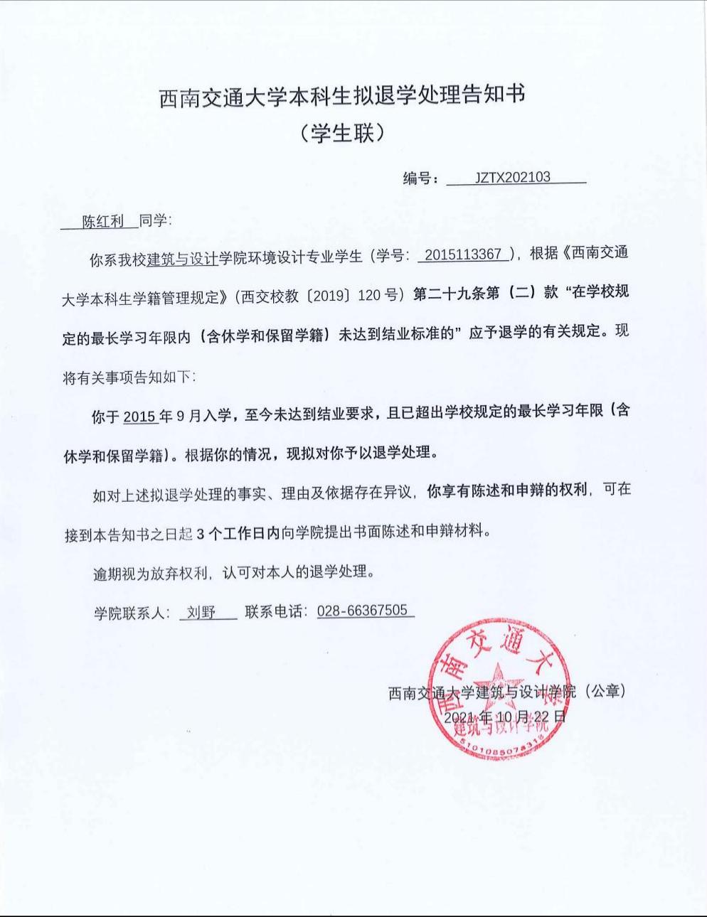 通过电话、网络、邮件等方式无法与本人取得联系,特发布此公告,具体内容见附件。自本公告发出之日起满10日即视为送达,如果对上述拟退学处理有异议,可在公告期满3个工作日内向云顶老虎机