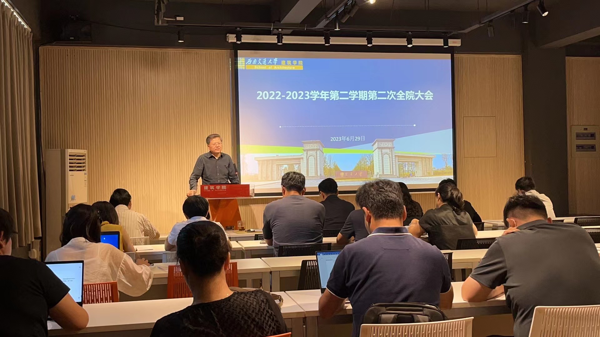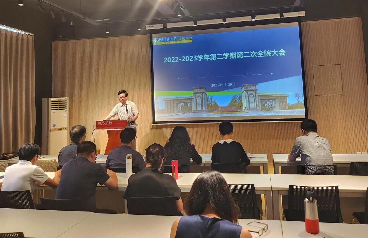 在犀浦校区8号教学楼A100报告厅召开了2022-2023学年第二学期第二次全院教职工大会,开展师德师风专题教育,并回顾总结本学期工作,部署安排近期工作。执行院长沈中伟,党委副书记刘一杰,副院长崔叙、杨青娟,云顶老虎机