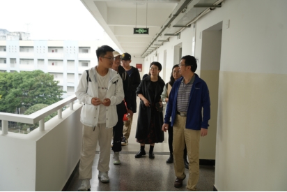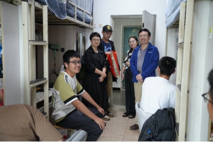 党委书记胡伟、党委副书记刘一杰、团委书记孔翔榆带领辅导员们于9月27日中午深入新生宿舍,开展走访慰问活动。