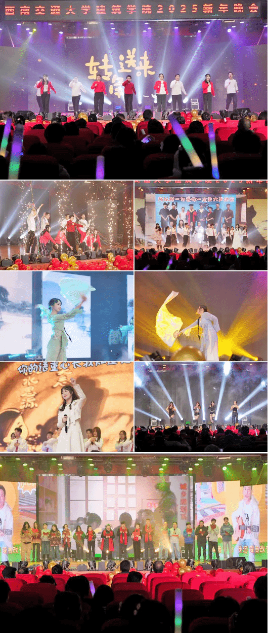 万江、熊瑛、宣湟等师生携手朗诵《相信未来》,激昂词句直击人心,唤起青春勇气。张曦予等6名同学的《舞蹈串烧》融合多元舞风,炫酷技巧嗨翻全场。程仕杰等6名同学深情献唱《有我》,以青春之声唱响担当。风景园林系老师们合唱《送你一朵小红花》,温馨旋律传递关怀与期许。杨孟燃等4位同学带来歌曲串烧《找自己》的迷茫探寻与《陪你度过漫长岁月》的暖心陪伴,引发观众共鸣,建筑系老师们带来《歌舞表演》欢快气氛感染全场。