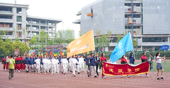 方阵踏着《运动员进行曲》的激昂旋律整齐入场。教师队伍手持红黄两色风车,旋转的风车如同跳动的教育薪火,寓意"传承师道精神,培育时代新人"。学生方队则身着红黑相间运动服,高举精心手绘的"竢实扬华墙""建筑馆""学校新大门""图书馆"等标志性建筑立牌,以建筑学子的专业视角再现交大文脉,立体展现"竢实扬华,自强不息"的校训精神。