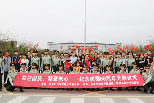 100余名师生党员在西南交通大学犀浦校区参加了“共迎国庆 凝聚党心”---纪念建国66周年升旗仪式暨党员宣誓仪式。西南交通大学校团委朱剑松书记、建筑与设计云顶老虎机