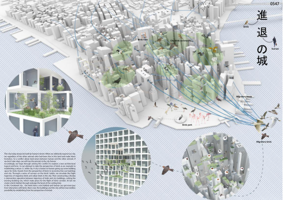 In this Combined city,the birds have a nice habitat and human can get more joys from interaction with birds. More over, the buildings and the city will be have endless possibility by establishing from the perspective of animal.