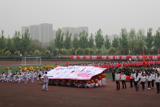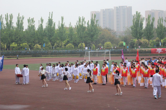 的老师、同学们经过辛苦的排练,迈着整齐的步伐、带着昂扬的气势在开幕式上留下一道青春朝气的风景线。