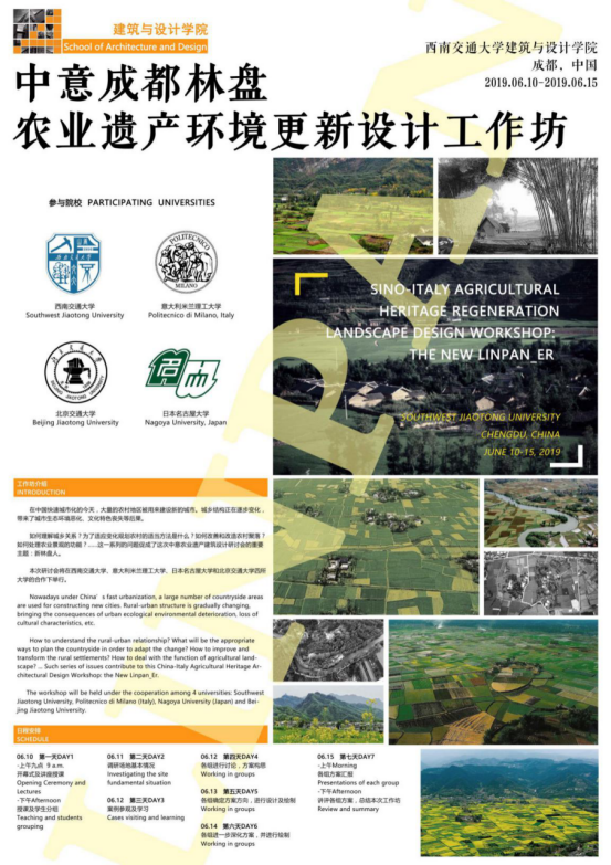 2019年6月10日-15日,中意成都林盘农业遗产环境更新设计工作坊由西南交通大学与意大利米兰理工大学、日本名古屋大学和北京交通大学国内外四所优秀高校师生联合成功举办。该工作坊旨在探讨在乡村振兴背景下如何改善和提升林盘生活环境的合理方法,同时也是云顶老虎机