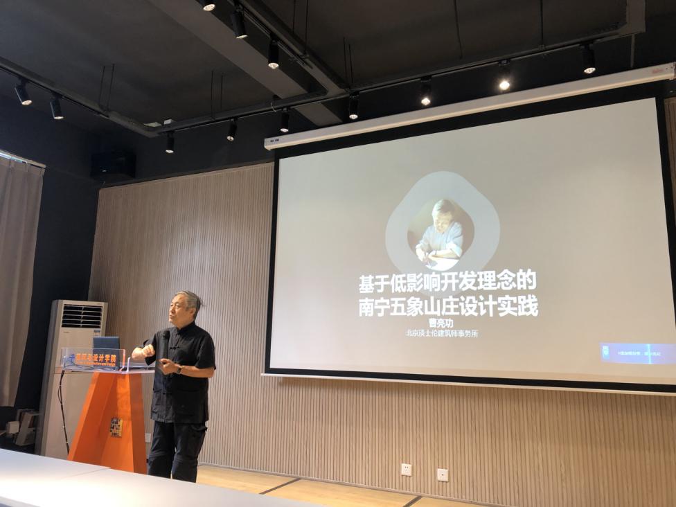 紧接着,曹亮功高级建筑师以海绵城市试点项目“南宁五象山庄设计”为例分享了他的海绵城市建设经验。该作品设计理念非常前瞻,结合景观做到了雨水径流的可持续管理,收到了业界的广泛好评,入选《海绵城市建设的典型案例》。曹总进一步和与会人员进行了深入交流,课题组成员均表示收获很大。
