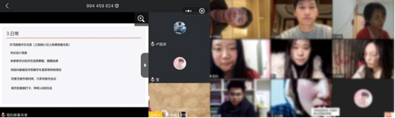 随后孔翔榆老师与同学们进行了互动交流,在互动中,孔翔榆老师表示,现在所有同学要停课不停学,学生干部以点带面,积极了解和掌握统计未修够学分同学情况,以及网上教学活动有困难的学生情况,提倡同学们在家注意运动,多关注网上求职信息。