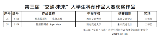 第三届“交通·未来”全国大学生科创作品大赛是由中国高等教育学会主办,上海交通大学、西安交通大学、西南交通大学、北京交通大学共同承办的大学生课外科技活动,是一项具有导向性、示范性和群众性的创新竞赛活动,旨在贯彻落实科教兴国战略,培养大学生的科技创新及实践能力,加强各高校学生之间科技文化交流,助推智能交通领域创新发展。该赛事每两年举办一届,大赛设置未来交通设计、未来智能交通、未来交通能源和未来交通治理四大类方向。
