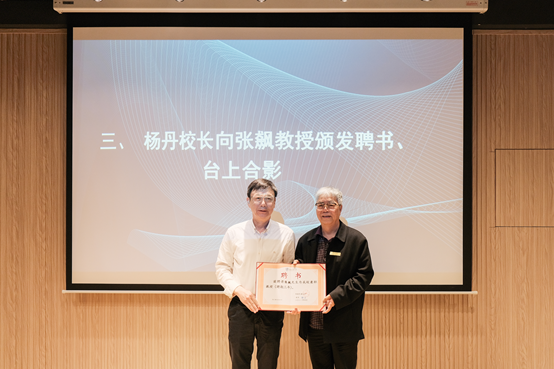 在朱健梅副校长的主持下,杨丹校长为张飙教授颁发西南交通大学兼职教授聘书,并为其佩戴西南交通大学校徽。张飙教授在发言中表示,衷心感谢西南交通大学将其聘任为兼职教授的这份至上荣誉,能够作为交大的一份子,也是圆了儿时的梦想。他将不负重托,利用所学所长为交大多做贡献、争做贡献。
