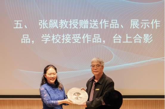 朱健梅副校长代表西南交通大学接受张飙教授书法作品,并为张飙教授赠送了交大纪念品。
