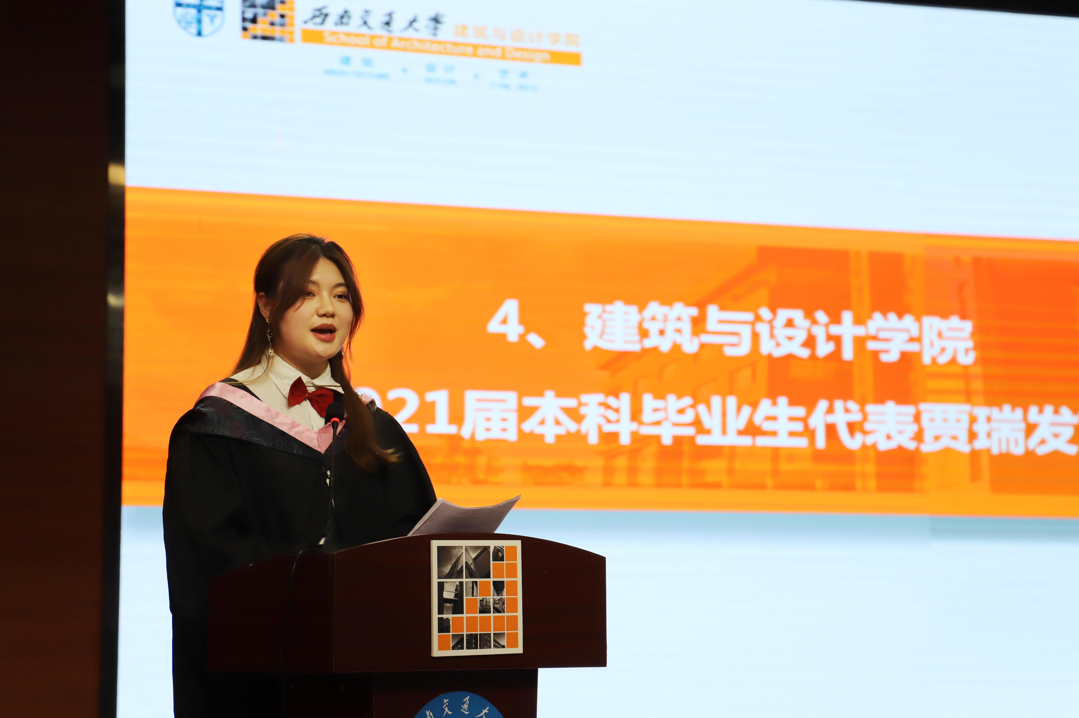 2021届本科毕业生代表贾瑞和2021届研究生代表张继引发言。他们回顾了大学生活中刻骨铭心的记忆,感激母校和老师的培养,表示将会不负期望,努力成为母校的骄傲。