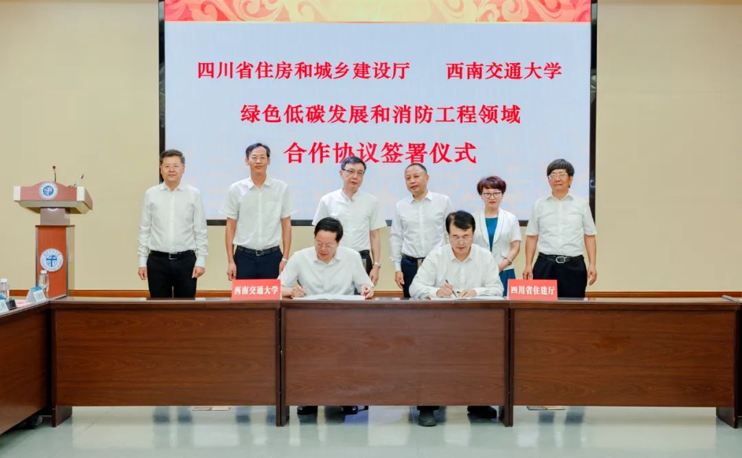 6月30日,四川省住房和城乡建设厅与西南交通大学在成都签署厅校合作协议,双方本着“优势互补、成果共享、携手同行、共谋发展”的原则,在城乡建设绿色低碳等方面开展全方位合作。省政协副主席、西南交通大学校长杨丹、住房城乡建设厅党组书记、厅长何树平出席签约仪式并致辞。西南交通大学党委副书记桂富强主持会议。在何树平、孔燕、邱建,杨丹、桂富强、沈中伟以及与会人员的见证下,住房城乡建设厅党组成员、副厅长刘恒与西南交通大学党委常委、副校长沈火明代表双方签署“绿色低碳发展和消防工程领域合作协议协议”。