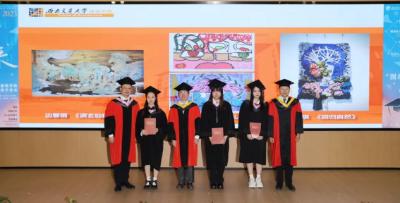 授位仪式后,执行院长沈中伟教授、院党委胡伟书记、院长助理刘春尧副教授接受本届学生代表赠送的毕业作品,同时向其颁发收藏证书。