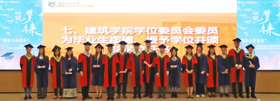 学位评定分委会委员为毕业生拨穗、授予学位,并合影留念,将典礼的气氛推向高潮。