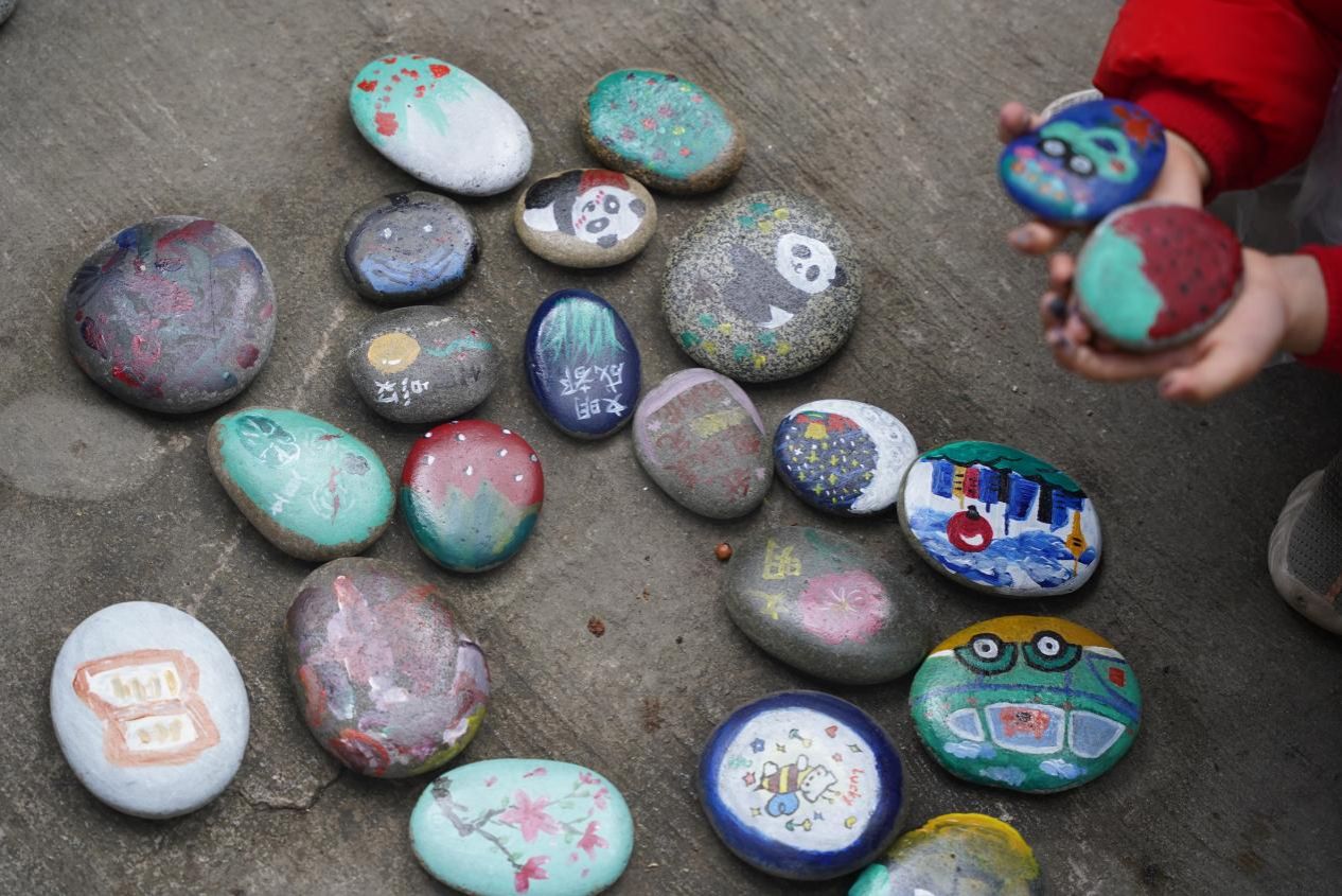 青年志愿者协会的大学生志愿者们将颜料、鹅卵石、调色盘、画笔等物料分配到每一张桌子上,现场吸引了来往居民们的驻足体验,有三岁左右的小朋友,也有年过花甲的老人。在志愿者们的指导下大家拿起了画笔,在石头上勾勒出脑海中的幸福图案,有绘有卡通画、山水画、写意画的,还有随形画、工笔画等,风格迥异 、各具风格。亲手将平平无奇的石头制作成独一无二的作品。每位活动参与者都感到非常自豪、有成就感,并相互展示交流并拍照留念。现场还挖掘到了一名“宝藏”院落达人摄影师刘铎琪定格这一美好瞬间。
