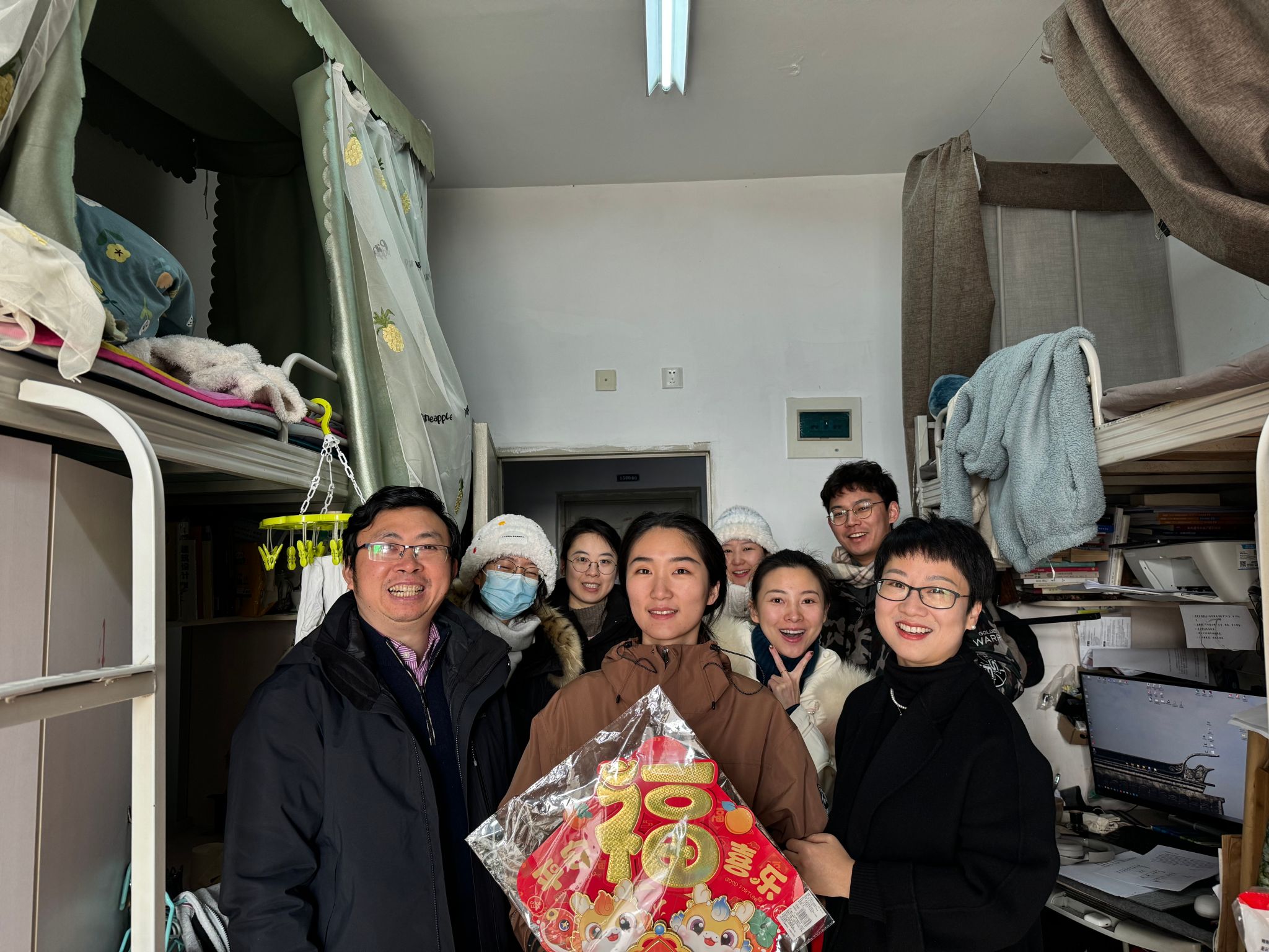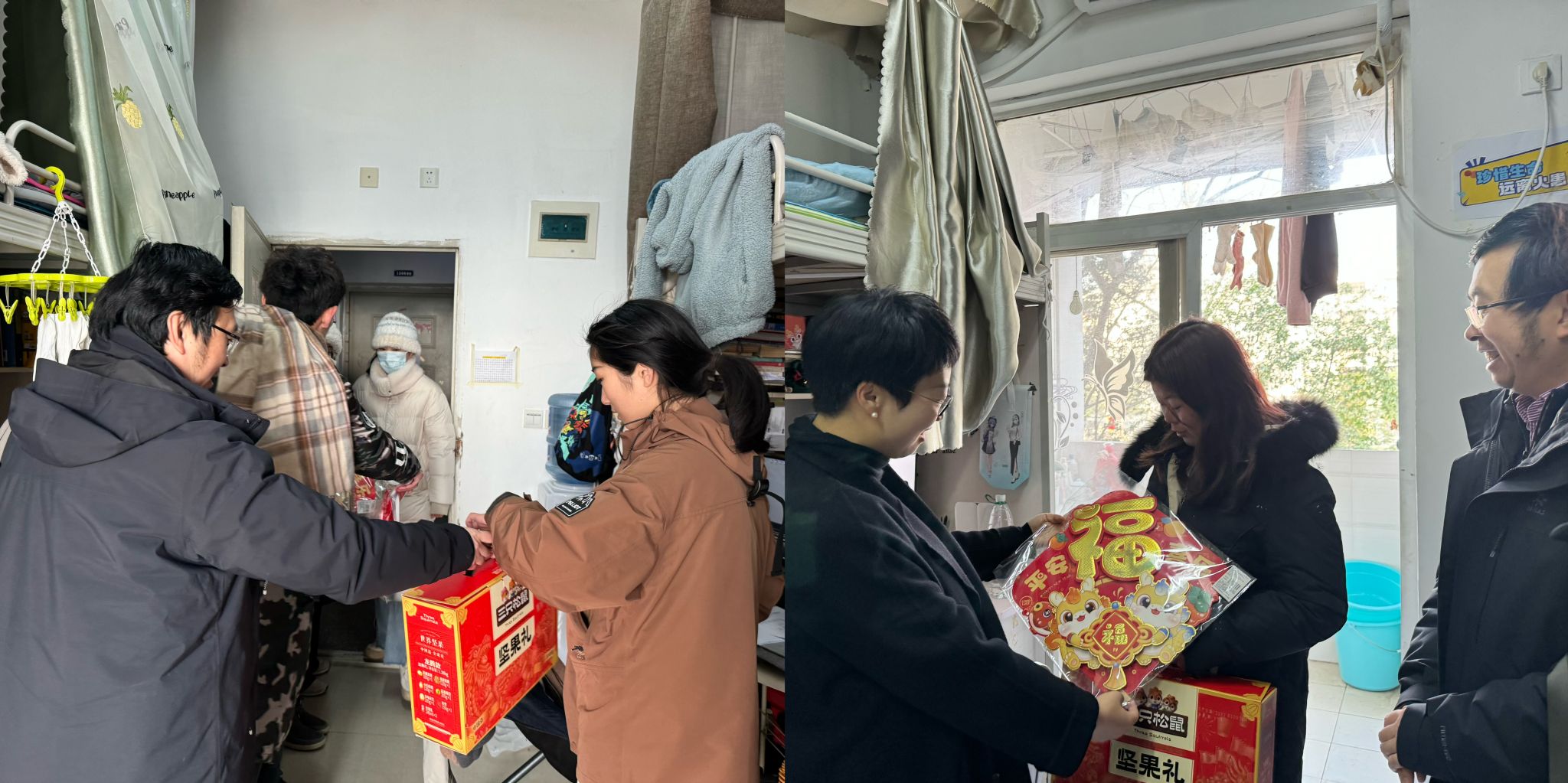 党委书记胡伟、党委副书记刘一杰以及学生工作组全体辅导员老师前往学生宿舍,与同学们共话成长、共叙情谊、共度新春。