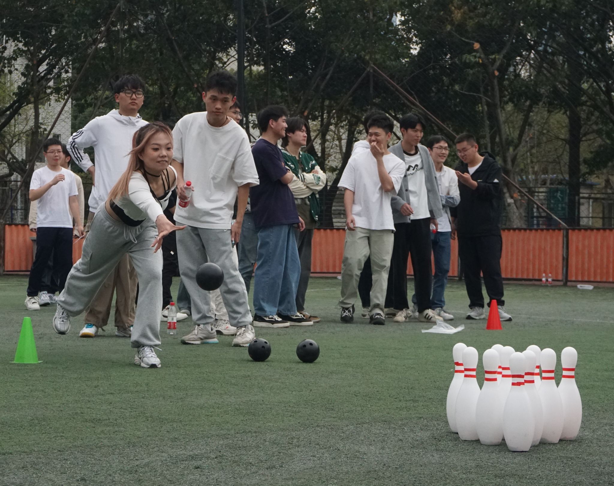 趣味运动会包括游戏、节目和颁奖三个环节,其中游戏环节共设置了四个比赛项目:三人四足/四人五足、珠行万里、积分争夺战(含趣味保龄球、飞盘和投壶)及躲避飞物。活动中,参赛选手们全力以赴、配合默契,认真对待每个游戏环节,最终有12个小组脱颖而出,获得奖品。