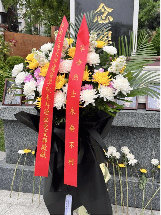 上午10时,佩戴手作白花的成员们在纪念碑前整齐列队。活动特别设置"手绘追思"环节:成员提前绘制的水彩英烈肖像卡、手写挽联花圈、原创主题包花纸等创意载体,将艺术表达融入缅怀仪式。在庄严肃穆的献花仪式中,由30余朵手折纸花组成的花圈中央,悬挂着"青春铸丰碑"主题绘画,两侧挽联"丹心昭日月,碧血染山河"墨迹未干,无声诉说着新时代青年对先烈的崇高敬意。