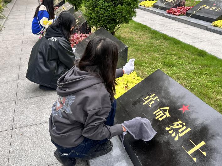 在"我为英雄护丰碑"实践环节,成员们分组开展墓碑清洁的工作。学生结合绘画专业技能,通过速写记录碑文图案,协作完成数十处烈士墓碑保护。"这张手绘的刘琍烈士纪念卡,我们特意标注了他牺牲时年仅26岁的信息。"活动负责人于昌泽同志介绍。
