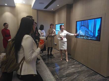 中午13时,全体同学乘车前往位于武侯区红牌楼的东原·印长江项目。在工作人员的带领下,先后参观了样板间和主题会所、观看了企业宣传片。“印系列”作为东原地产的高端产品品牌,其精致的产品品质、丰富的景观体验和家居设计、完善的社区配套、贴心的物业服务等引得同学们连连称赞,同时也感受到了市场产品设计与校园课程之间的区别。