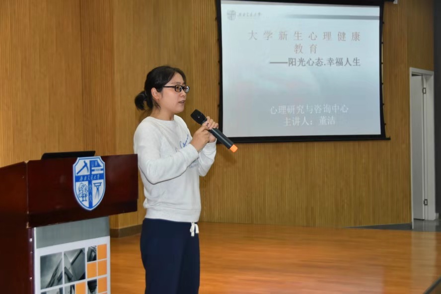 在八号教学楼学术报告厅开展了“大学新生心理健康教育——阳光心态.幸福人生”心理健康教育专题讲座。此次讲座由心理研究与咨询中心的董洁老师主讲。