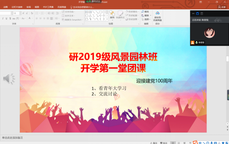 研2019级风景园林团支部举行了“开学第一堂团课”活动。活动采用了线上会议的方式进行,支部全体成员参与了本次团课学习。