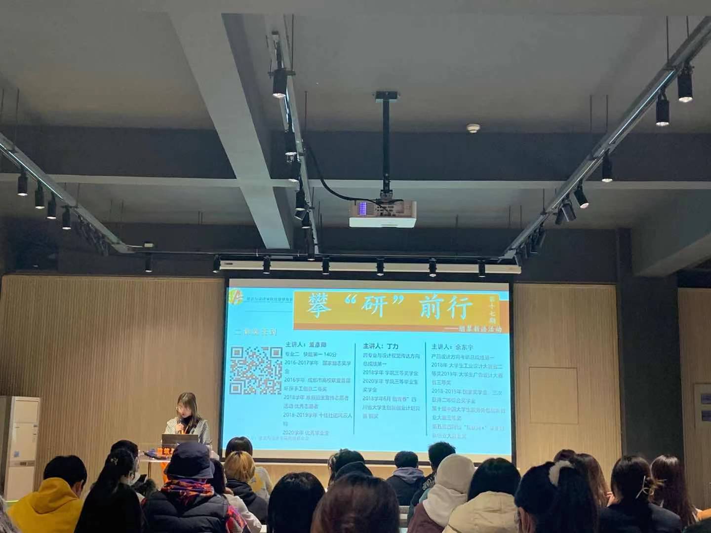 本次活动由环境艺术方向董彦卿同学,视觉传达方向丁力同学与产品设计余东宇同学担任主讲人,三位主讲人向同学们分享了“研途”的心路历程及考研经验。
