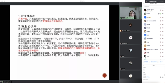 大会开始,杨珂老师对就业推荐表和就业协议书的填写流程逐条进行介绍,强调了同学们应该严格遵守就业协议签订过程中的相关规定。随后杨珂老师详细介绍了同学们派遣信息的填写和档案转接流程,并提醒大家尤其注意时间节点问题,多与相关单位沟通,了解相关政策。杨珂老师对党员同学的党组织关系转接也做了详细讲解。