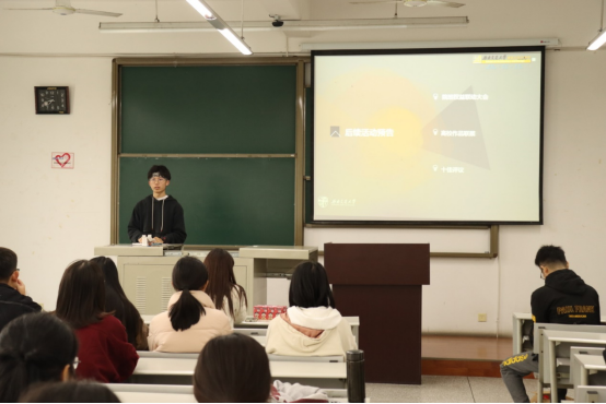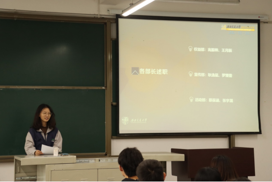 学生会权益部、宣传部、活动部部长以及主席团成员分别对部门职能以及近期开展工作进行了汇报分享,使干事对各部门只能更加了解,以便后期工作的开展。
