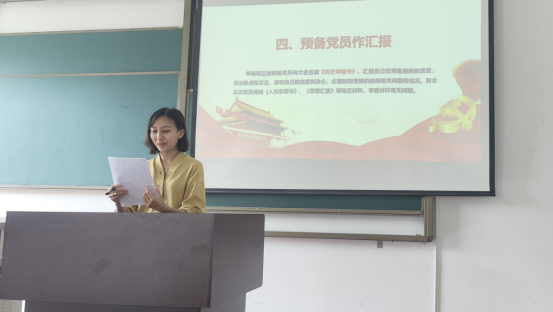 博士党支部在X8321教室召开预备党员转正会议。此次会议中马杰茜同志发表转正志愿,并顺利由中共预备党员转为正式党员。