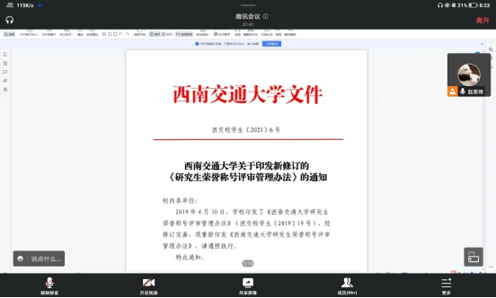 大会初始,赵思琦老师带领全体同学对《西南交通大学研究生荣誉称号评审管理办法》、《西南交通大学学生纪律处分规定》、《西南交通大学学术道德规范》进行了学习,紧接着对本学期组织开展2021-2022学年研究生荣誉称号评审工作进行了说明,从评选条件、评选程序和注意事项等方面进行了阐述,强调评优过程应本着“规范、公平、公正、公开”的原则,杜绝在评优过程中存在弄虚作假、学术不端行为,把握重要的时间节点,规范填写并及时提交申请材料。目前多地再次出现疫情,赵思琦老师强调,本次评选也将结合学生疫情防控期间的综合表现,对学生(班级)提交的申请材料及评选条件进行审核,对同学们存在疑问的地方,进行了重点解答。