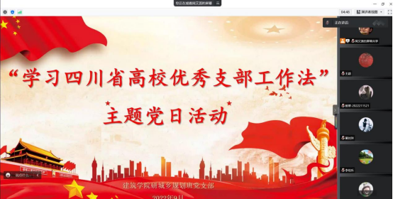 为加强党支部标准化、规范化建设,不断提高党支部建设质量,9月22日14:30,研城乡规划党支部在线上召开“学习四川省高校优秀支部工作法”组织生活会。本次会议以集体学习为主,交流讨论和个人自学相结合形式开展,由周艾莲同志主持。