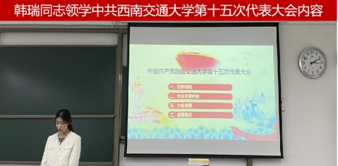 随后,韩瑞同志带领全体党员学习中共西南交通大学第十五次代表大会的主要内容,从召开时间、大会主要内容、大会主题以及重要意义四个部分进行了详细阐述,对学校第十五次党代会精神进行了重点传达,就我校当前和今后改革建设发展的重大问题进行了讲解。韩瑞同志强调,支部要坚持以习近平新时代中国特色社会主义思想为指引,紧紧围绕学校的发展思路,不断加强学习教育,贯彻落实本次党代会精神。全体党员认真学习会议内容,表示将不断强化责任担当,践行初心,以更加自信自觉的历史担当,投身于建设交通特色鲜明的世界一流大学的新征程!