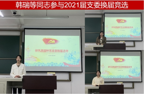 最后,韩瑞同志组织了研风景园林党支部换届选举活动。研风景园林党支部书记赵思琦同志、组织委员陈珏汶同志和宣传委员高爽同志阐述了在党史学习教育、支部建设等工作中取得的显著成效,对新一届支委会如何更好地开展工作提出了建议和期望。韩瑞同志、章倩茹同志、周易同志参与新一届支部委员会选举,表示在今后的学习工作中将继续努力,充分发挥党员先进性,为支部建设添砖加瓦。选举过程严格遵循“公开、公平、公正”的选举原则,按照选举办法和有关程序,采用无记名投票差额选举的方式,最终选举产生了韩瑞同志为新一届党支部书记,章倩茹同志为组织委员,周易同志为宣传委员。