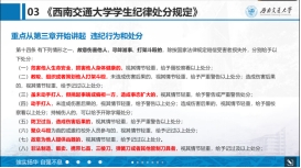 本次讲座分为五个部分:一、请销假、校外住宿、实习备案等请假手续讲解;二、解读《宿舍管理办法》;三、解读《西南交通大学学生纪律处分规定》;四、新生入学安全提示;五、防诈安全教育。