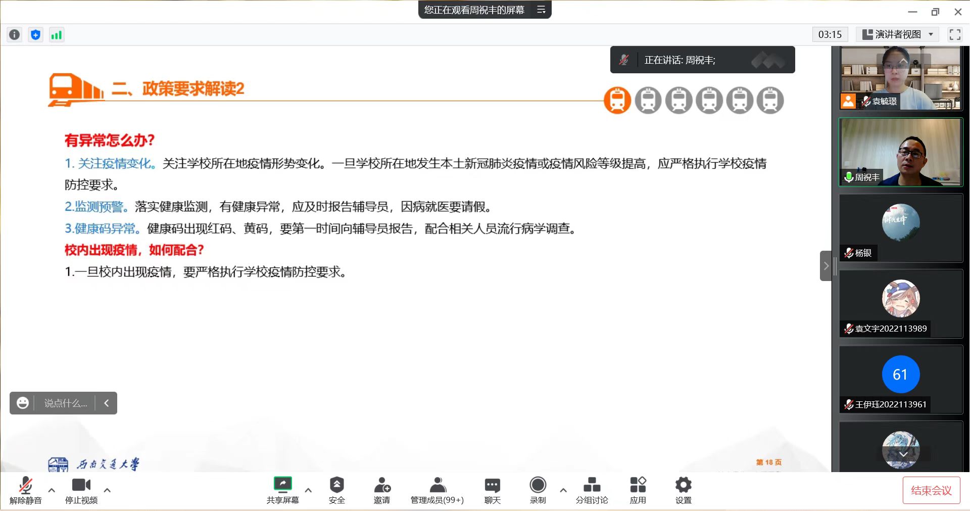 学生工作组赵思琦老师针对勤俭节约教育专题召开了先进人物事迹学习会,学生支持办公室主任刘野老师宣传普及了艾滋病防治相关知识。