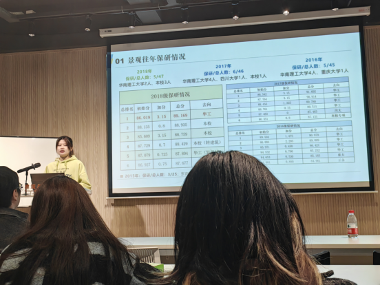 分享会上,徐宇飞同学与大家分享了他的个人保研经验,为大家讲解了建筑学专业保研所需的各阶段准备,并列出时间线,使参会同学对保研流程有了更加全面的了解;吴爱千同学为参会者解读了城乡规划专业的保研政策,并细致介绍了不同高校的夏令营特色及所应做的相应准备;风景园林2018-01班的张润旋同学则为大家梳理了风景园林往年保研的概况,并分享了其个人保研经验,为低年级同学提供了个人建议;来自公共艺术专业的夏姿彤同学则从个人经历出发,更多地为大家介绍了跨专业学习、保研以及竞赛相关信息,为大家展示了她的部分作品以及运用个人优劣的经验。四位同学诚心准备,细心介绍,精心分享,参会同学受益匪浅