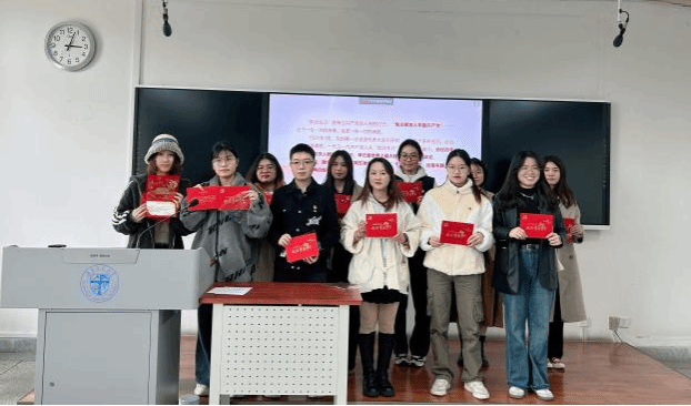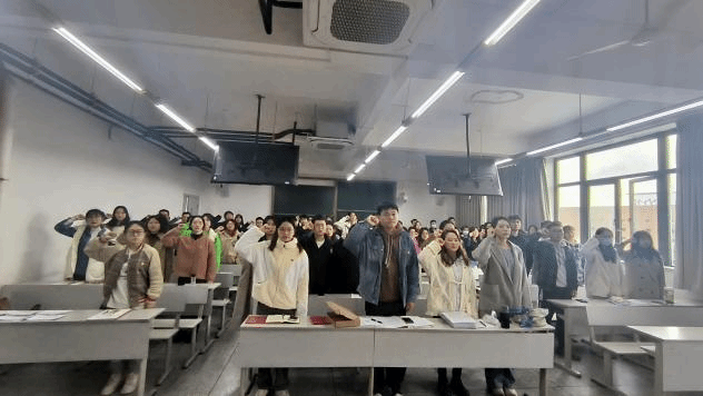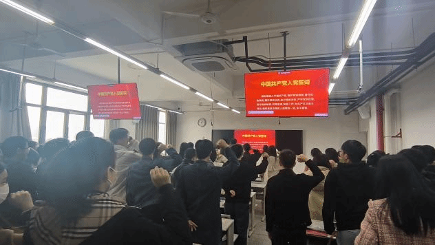 会议伊始,支部同志们集中学习了习近平总书记近期重要讲话精神。本次学习重点从“铸牢中华民族共同体意识”、“构筑中华民族共有精神家园”、“中华民族大团结促中国式现代化”、“讲好中华民族故事扬共同体意识”四个方面研习习近平总书记在中央政治局第九次集体学习时的重要讲话精神,并结合习近平同志在第三届“一带一路”国际合作高峰论坛开幕式上的主旨演讲,加深对重要讲话精神的理解。随后,由袁诗雨、黄思倩同志带领支部同志进行《中国共产党党徽党旗条例》的学习,详细讲述了党旗与党徽背后的故事与蕴含,如何在合适的场合正确使用党徽党旗,强化了党徽党旗的正确使用要领。接着,结合《条例》的学习成果,支部党员同志齐过“政治生日”。关心茹、李今朝、赏芹等同志积极发言,重温入党故事,追忆入党初心。党支部为党员同志们精心准备了贺卡,贺卡中印写着对每位党员的祝福和期盼,希望支部全体党员同志能够牢记入党誓词,践行初心使命。在袁诗雨同志的带领下,支部全体党员重温入党誓词,在铿锵恢宏的誓词中不断坚定理想信念。