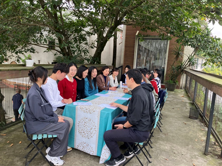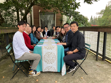 风景园林党支部组织全系教师在乡村振兴发展中的安靖街道蜀绣公园中共同学习党的二十大精神。