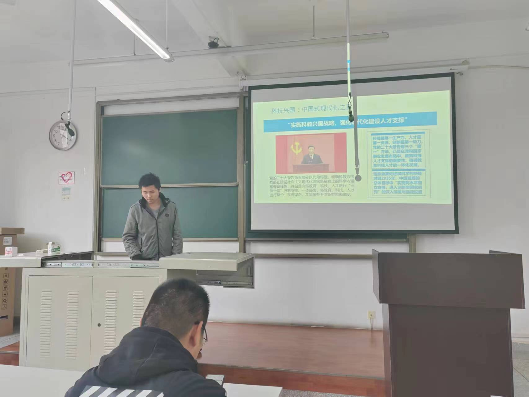 会议开始,肖旺、范凯琳、杨谨谊三位同志先后分享了主题为“核力筑梦 ,科技兴国”的个人学习PPT。肖旺同志结合科幻影片分析了我国目前科技发展的现实困境以及科技兴国的重要性,范凯琳同志回顾百年来党的科技思想和科技实践的伟大历史,杨谨谊同志则主要讲述了科技自立自强是国家强盛之基、安全之要的内涵与意义。
