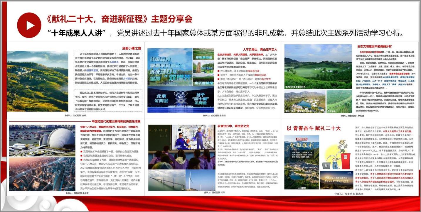 本科风景园林党支部开展“十年成果人人讲”主题分享会。通过讲述过去十年国家总体或某方面取得的非凡成就,从自身发展、支部建设等角度交流研讨,了解应如何以实际行动为党的事业发展贡献自己的一份力量。活动中,党员们积极参与,有的从衣食住行察生活之变、有的结合专业兴趣赞美乡村振兴、还有的用生动范例展望生态文明建设。