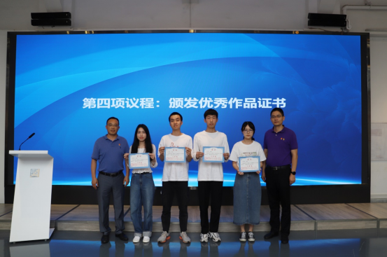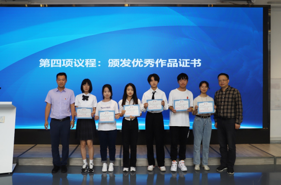 党委书记吴晓雄在颁奖仪式上公布了获奖作品名单。出席的领导为12名获奖同学颁发证书。获得一等奖的吕薇同学作为获奖代表发言,讲述了参加本次活动的心得体会。